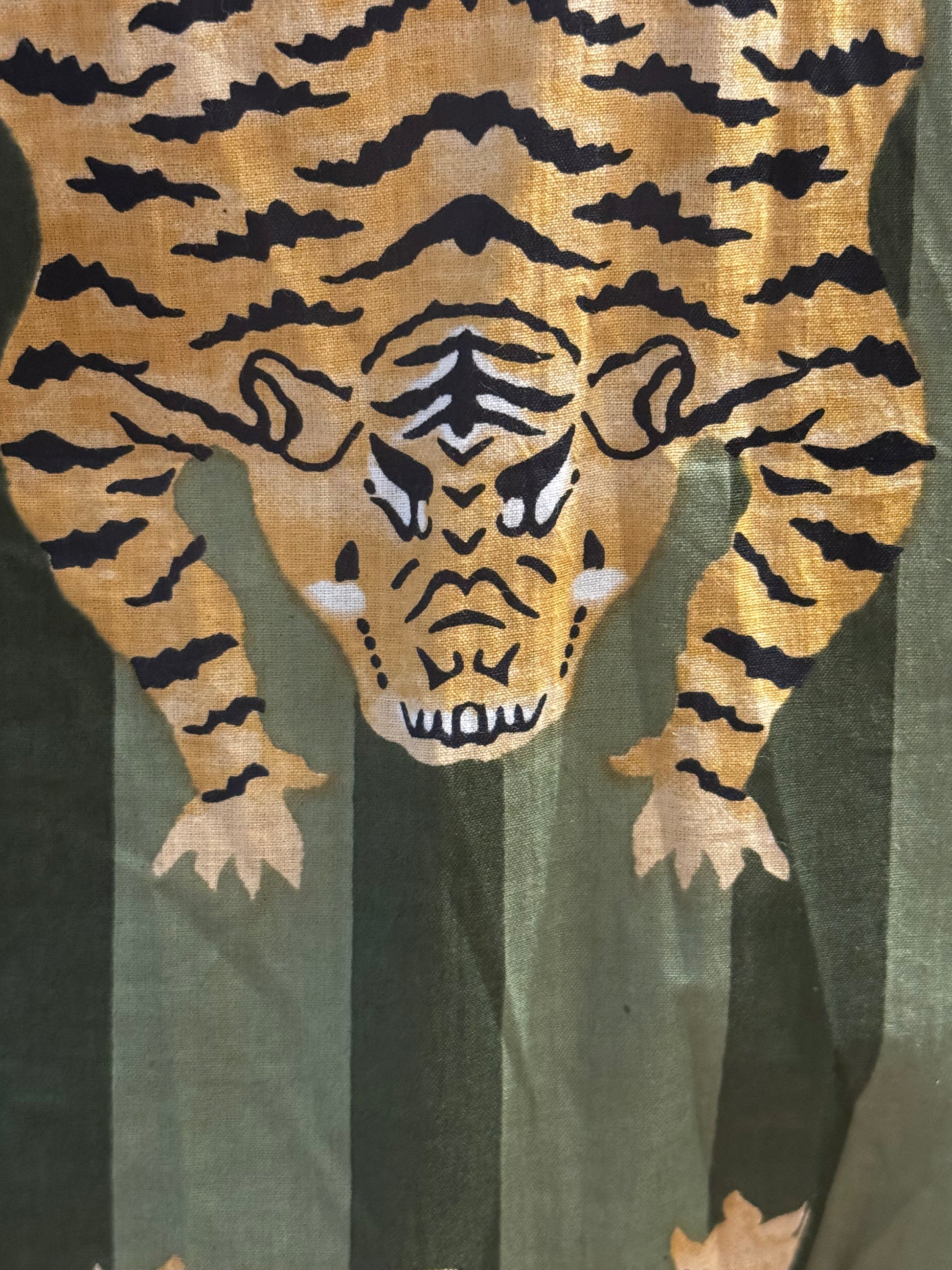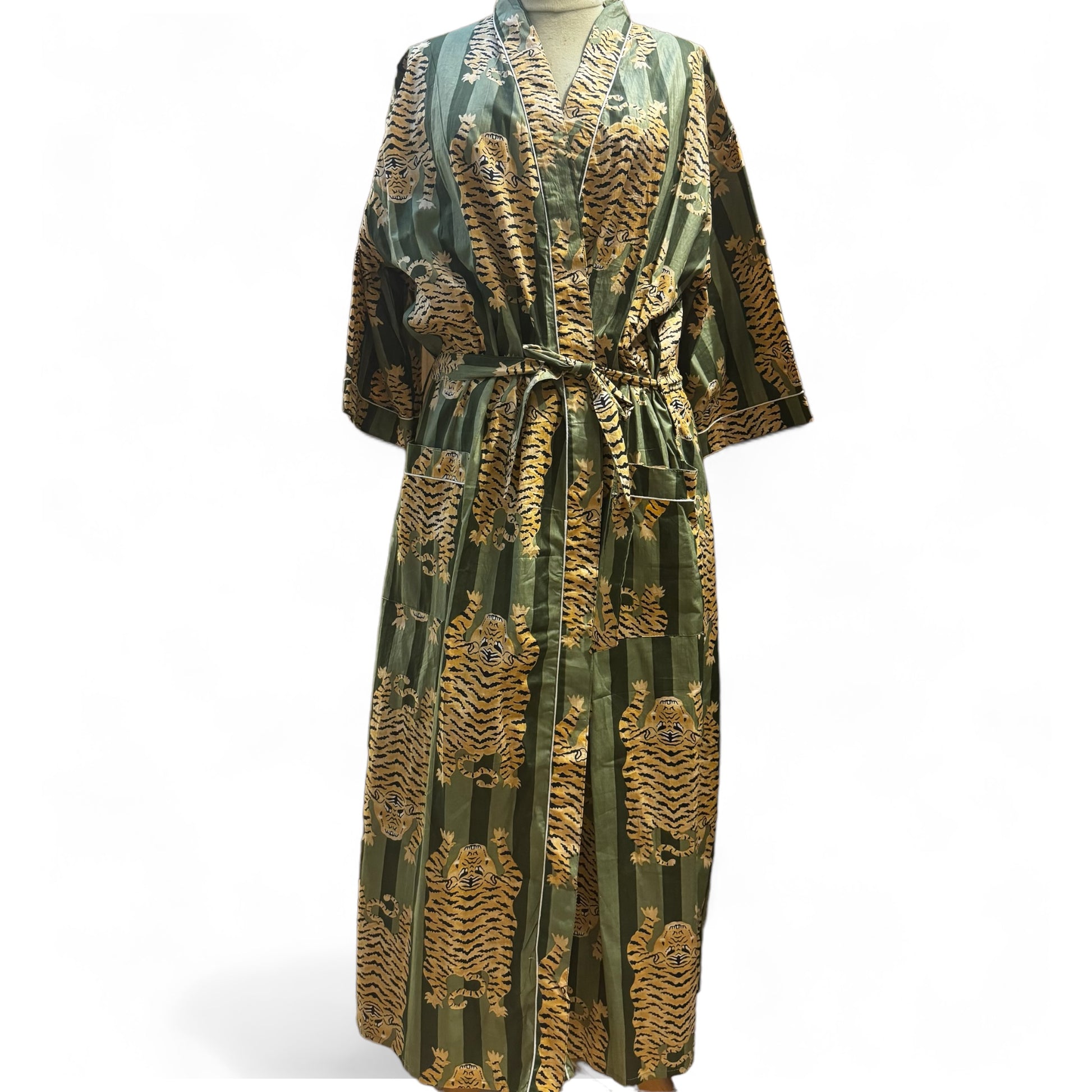 Peignoir en coton, très agréable motif tigre kaki à rayures ton sur ton.